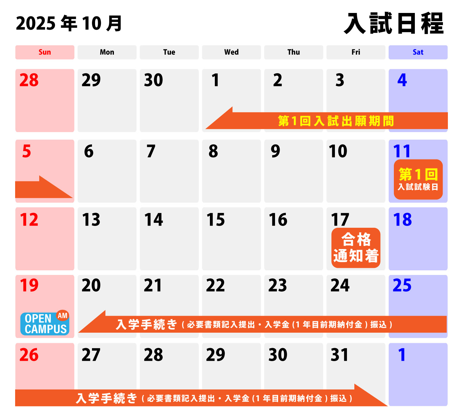 合格発表 | 第1回入試の合否通知を「2025年10月17日金曜日着」郵送にて送らせていただきます。 |