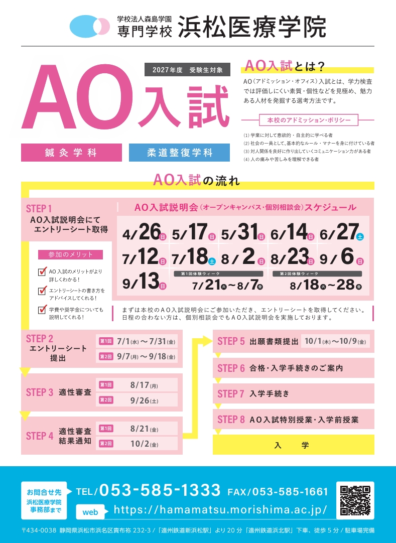 | AO入試エントリー書類 | 1.AO入試エントリー書類の入手方法 4月〜8月のオープンキャンパス内で実施される「AO入試説明会」に参加し、AO入試エントリー書類を入手して下さい。▶︎オープンキャンパス日程一覧 2.AO入試エントリー書類の入手資格 下記3点の項目を全て満たすと、AO入試エントリーシートを入手できます。 ・浜松医療学院開催のイベント(オープンキャンパス・個別相談・体験ウィーク)に参加した方。(参加証明書に押印) ・浜松医療学院開催のイベント(オープンキャンパス・個別相談・体験ウィーク)で実技体験に参加した方。(参加証明書に押印) ・浜松医療学院開催の「AO入試説明会」に参加した方。(参加証明書に押印) 3.エントリーシートの書き方 ・記載指示に沿って空欄を記入して下さい。 ・高等学校の担任もしくは進路担当の教員の署名および押印が必要となります。こちらの書類をご記入の上、高校の担当教員へ渡し、署名・押印をして頂いてください。 ①志望理由書 ・あなたが本校のAO入試にエントリーした理由や、資格取得の動機を教えて下さい。 ②あなたのアピールポイント ・本校のアドミッションポリシーに照らし合わせながら、あなた自身の事やあなたがこれまで頑張ってきた事について教えて下さい。 ③AO指定課題 ・エントリーを志望する学科の取得資格について、その特長や具体的な仕事内容を調べて説明して下さい。 ④オープンキャンパス参加証明書 ・オープンキャンパスまたは個別相談会参加証明書、AO入試説明会参加証明書、実技体験参加証明書に本校印鑑検印。 |