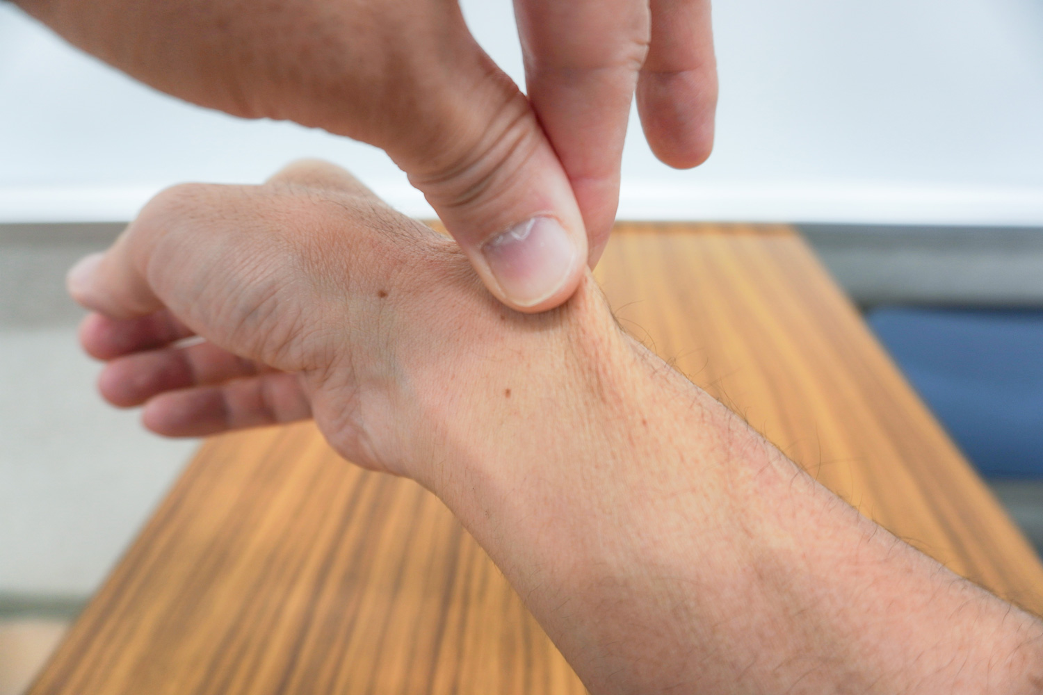 皮膚をつまんでみて、違和感のある所を探す診察方法です。