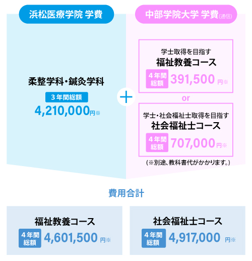 4年間で柔道整復師 or はり師・きゅう師の資格と、大卒資格(学士) + 社会福祉士の資格取得を目指せます。